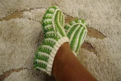 Когда связали мысик набираем по краям мысика петли,и продолжаем вязать высоту тапочка.