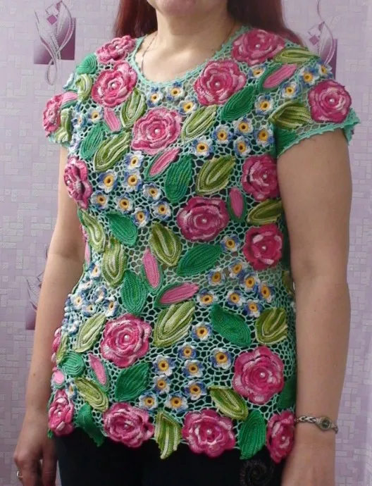 Блузка выполнена в технике ирландское кружево,все мотивы выполнены отдельно и соединены между собой более тонкими нитями нерегулярной сеточкой с помощью более тонкого крючка.