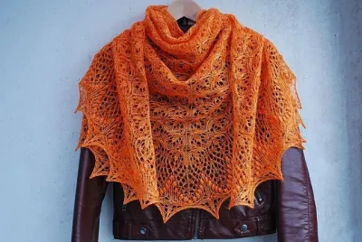 Спрячьте концы нитей. Опустите шаль в теплую воду на 30 мин. Отожмите и равномерно растяните шаль по форме треугольника, закалывая булавки в середину лепестков. Дайте изделию полностью высохнуть и снимите с булавок.