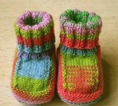 Пинетки спицами для новорожденных выполняются лицевыми и изнаночными петлями, лицевой гладью сверху стопы и резинкой на манжетах.