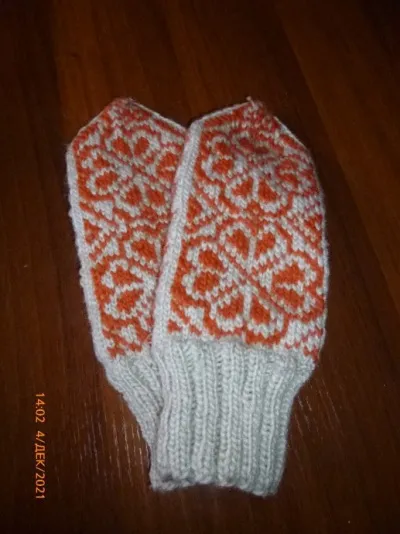 Просто у меня остался большой клубок тех ниток, из которых связано оплечье. И вот я в сомнениях, или варежки связать, чтоб уж одинаковое было или ещё что придумать…