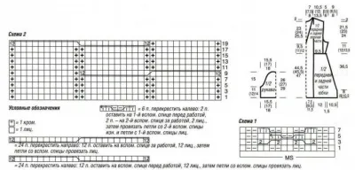 Узор с косой (ширина 36 п.): вязать по схеме 2, на которой приведены только лиц. р. В изн. р. петли вязать изн.