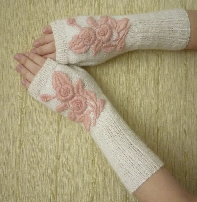 очень нравится вязать и вышивать. Научилась совсем недавно делать вышивку по вязаному полотну. Получились вот такие митенки