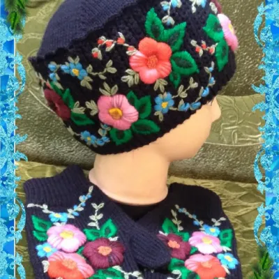 художественная идея варежек Марины Мишиной. Шапку разрабатывала сама. Комплект отправится в Находку, Приморский край.