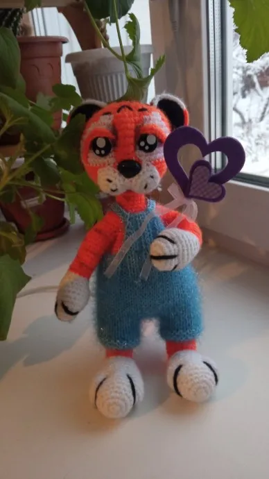 Приветствую всех! Тигр Тимоша тоже. Вязала из ярнарт элите 300м/100г, крючок №3. Комбезик из ярнарт christmas, 142м/50г, спицы №3, 3,5. Рост 23см, проволочный каркас, стоит сам.