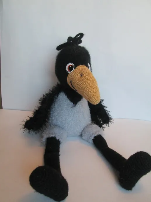 Вязала в прошлом году ворону по МК " ворона Алена". Пряжу взяла другу, не такую как в МК. За основу взяла черный акрил с мохером, а пузико связала из КХТ.Пряжа немного толще и соответственно размеры игрушки изменились. Ножки на проволочном каркасе уже не держали мою ворону. Пришлось изменить длину и форму ног. А вот с крыльями и хвостом была неувязочка. По описанию они вышли маленькими.