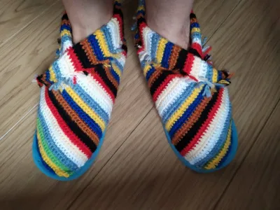 Связала крючком тапочки из остатков пряжи,а можно и спицами платочной вязкой.Очень просто:прямоугольник, длинная сторона которого это замер по периметру подошвы, а короткая- это высота тапочки, вот и всё. Подошва от старой пары тапок, вложила шерстяную стельку, пришивала тонкой леской.