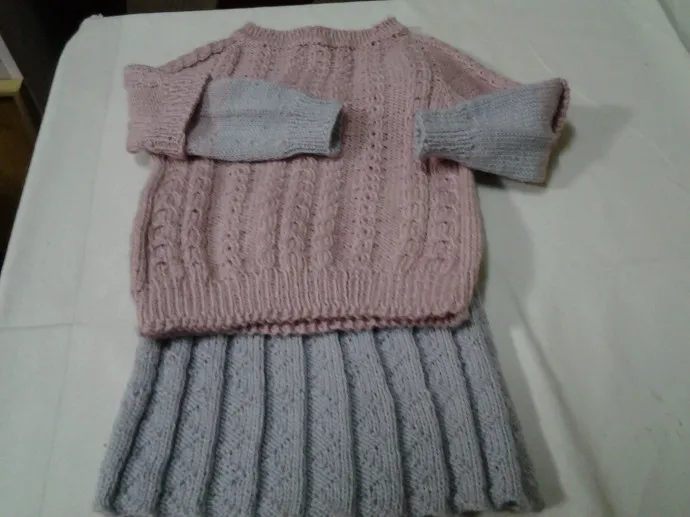 юбка в складку и кофта с косами ,реглан пагон. Вязала из нитки полушерсть,бебивул.