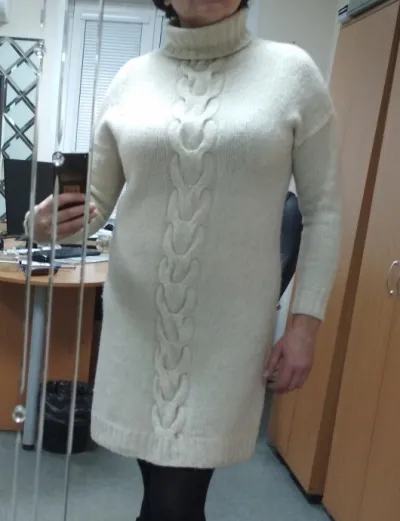 Платье связано из итальянской смесовки ( меринос + шерсть на хлопке) снизу вверх без единого шва спицами №4мм. Плечо немного приспущено и соединено методом 3-х спиц. По плечу вывязан росток ( методом Ольги Серёжиной, спасибо ей), сделаны подрезы. Платье получилось лёгкое, тёплое и комфортное. После ручной стирки платье подсело, но для меня не критично.