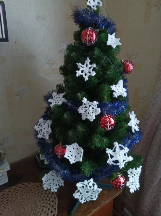 В этот Новый год захотелось мне украсить елочку вязаными снежинками, работа доставила удовольствие.