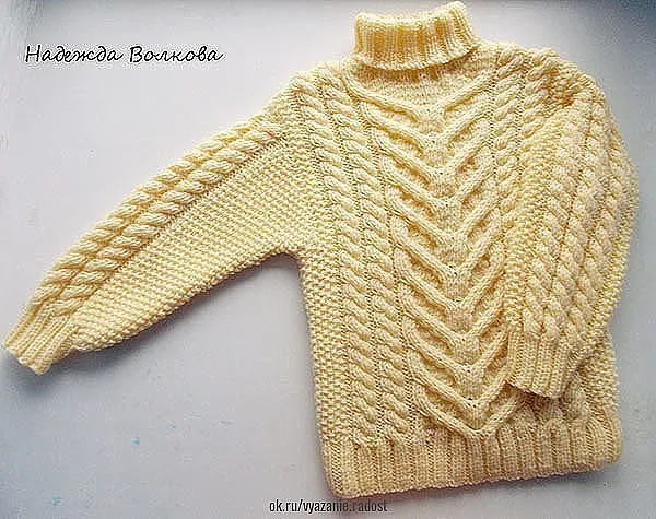 Свитер с косами для мальчика на рост 110. Пряжа Нако бамбино в 2 сложения, ушло 11, 5 мотков, спицы 3,5 и 4,5.