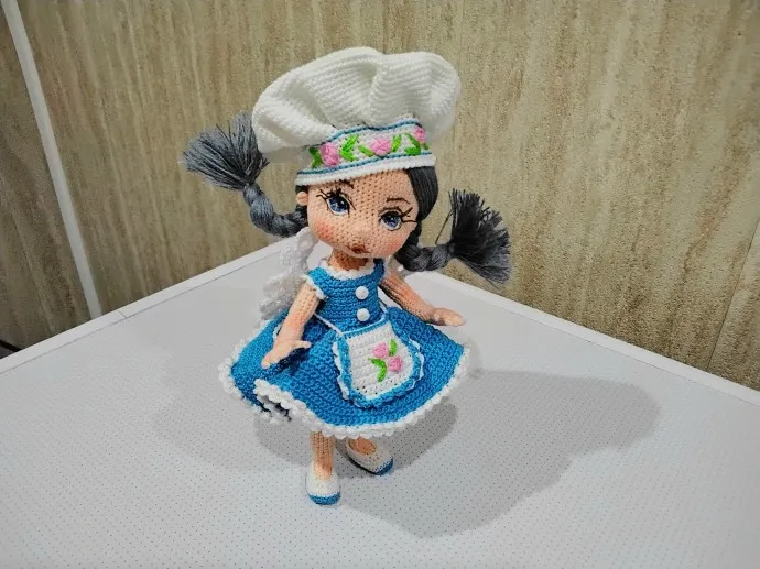здравствуйте, очень долго не брала в руки крючок, у меня всегда так, если взяла в руки спицы, то надолго. Вот взяла крючок, спицы всторону тоже надолго. Связала куколку по МК oksana_somati,куколка связана из хлопковой нити крючок 0,7. Рост 18 см, с колпаком 23см. Куолка на проволочном каркасе,стоит самостоятельно, глазки вышиты мулине, вышивала первый раз,шапочка,туфельки снимаются.