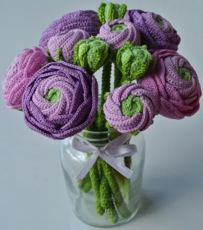 Люблю цветы. Мне всегда жалко выбрасывать завядшие цветы. Поэтому решила связать букет ранункулюсов. Работа шла долго, почти три недели. Вязала для удовольствия по вечерам. Букет выполнен в моей любимой цветовой гамме.