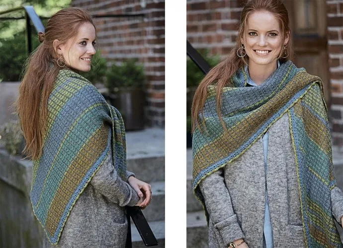 Интересная шаль, связанная из пряжи пяти цветов, подойдет и к пальто, и к куртке, и к шубке.