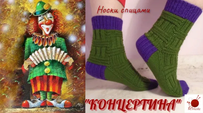 Концертина? Это маленькая гармошка, странной формы, иногда едва видная в руках исполнителя, с незабываемым звучанием. Услышав ее однажды, вы уже никогда не спутаете ее голос ни с каким другим. Когда мне говорят - концертина, я вспоминаю буффанаду Славы Полунина... Не правда ли, рисунок этих носочков чем-то напоминает ребристые меха маленькой гармошки. А уж удовольствие от его вязания и полученного результата - просто песня... А еще мы рассказали вам в этом видео, как связать пятку контрастным цветом, перенести начало ряда в середину подошвы и при этом не обрывать нить основного цвета. При всей визуальной сложности, носочки очень простые, их свяжет любая мастерица. Внося небольшие изменения в форму пятки, мыска и схему резинки, варъируя количеством петель, вы можете получить в итоге приятный сюрприз. Одноцветные, многоцветные, из пряжи секционного крашения, из "крапчатой" пряжи, в любом случае они покоряют с первого взгляда и обманчивой вычурностью, и неожиданной легкостью исполнения. Носки не имеют ограничения по возрасту и полу.
