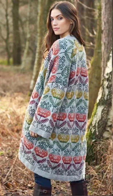 Яркое и объемное пальто от Мартина Стори Moonflower связано жаккардовым узором из шерсти мериноса с альпакой. Изделие состоит из нескольких деталей, хотя опытные вязальщицы могут преобразовать выкройку для работы по кругу с использованием техники разрезов.