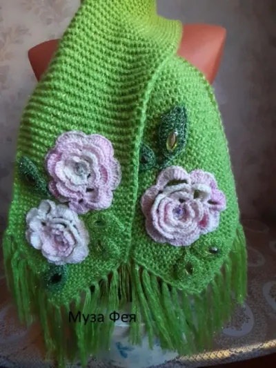 Связала шарфик из "Ализе симли" в две нити. Вес с цветами - 120г. Цветы связаны из секционной бело-розовой пряжи крючком. Листики - крючком из пряжи "Кристалл" двух оттенков. Аппликации украшены стразами и нашиты на шарфик сверху. Края шарфа оформлены в виде уголков. Начало - с 3 петель, прибавлять по бокам по 1 петле после и до кром. петли, в каждом лицевом ряду.