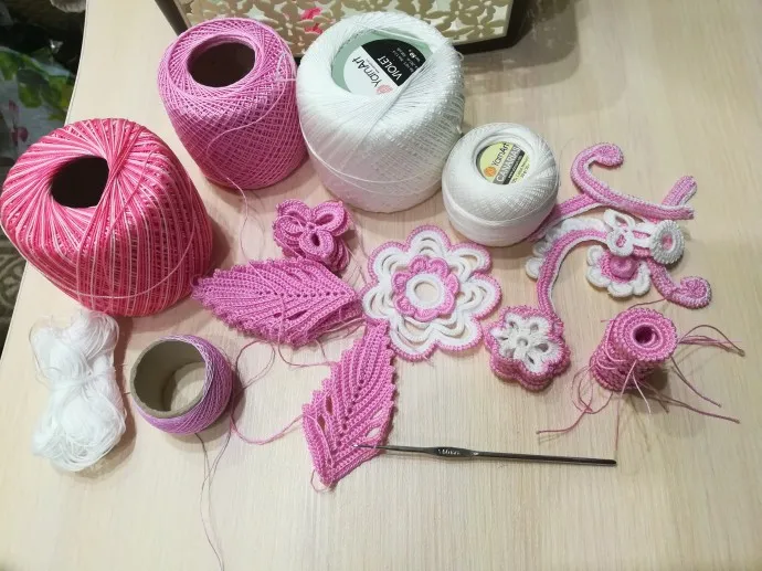 кардиган в технике "Ирландское кружево"Начало работы, подбираем цвет нити, выбираем элементы, крючок 1 мм