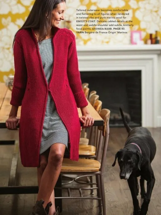 Для вязания нужно обзавестись пряжей Bergere de France Origin’s Merinos цвета flame (пламя): 19 (или 21, 23, 25, 27) мотков. Также понадобятся круговые спицы на 44 мм и длиной в 32”, маркеры, спица для вязания кос, гобеленовая игла, петледержатели, и подходящая по цвету молния длиной от 30”.