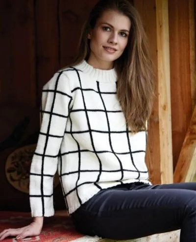 Тонкие черные пересекающиеся линии выглядят удивительно эффектно в сочетании с предельно лаконичной формой объемного джемпера.