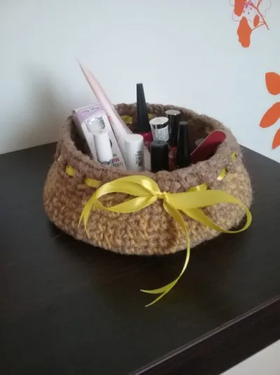 Корзинка связана из джутовой нити с добавлением нитки контрастного цвета. Подходит для хранения всяких "нужностей"
