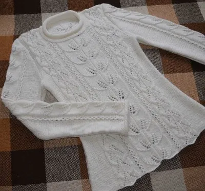 Пуловер с ажурным узором и узором "листики", вяжем спицами