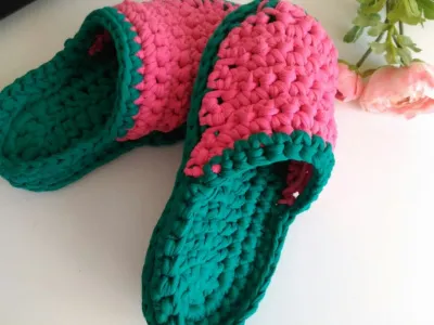 Я сделала двойную подошву, использовала покупную пряжу российского пр-ва "Бейка" 2-х цветов, крючок номер 8. Один тапочек склеивала с помощью горячего пистолета, второй - сшивала нитью.
