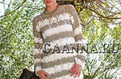 ..........Двухцветная туника в полоску из журнала Hakeltrends № 27/2014 связана крючком № 5,5 из 300 г бежевой и 250 г белой пряжи (100% хлопок; длина 100 м/50 г). Размер туники 44-46/50-52.
