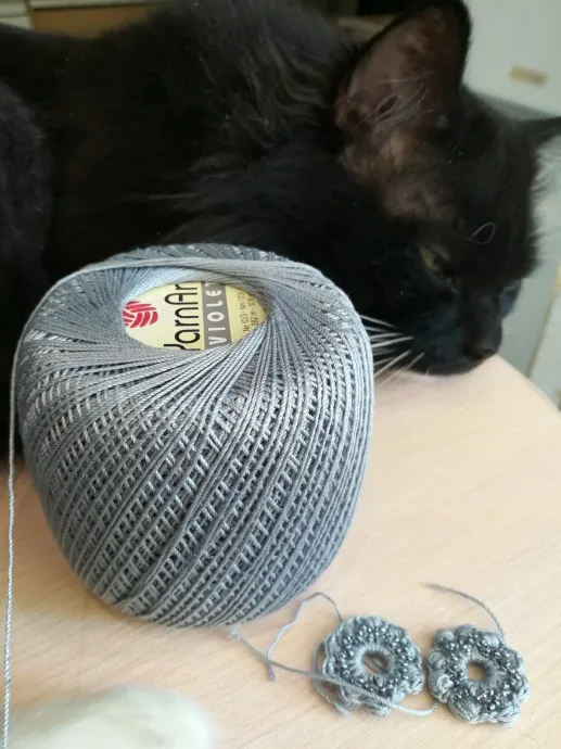 Кот всегда присутствует при вязании, при нем падают на пол нитки, крючки, сотовый телефон, ножницы.Он кот Маркиз готовит себе место рядом со мной и так 12лет подряд.ПОМОШНИК.