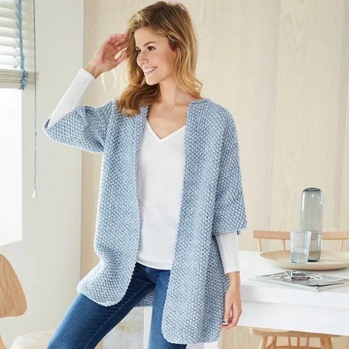 Правая полочка: двойной нитью набрать 30/34/36/38/42 п. и вязать жемчужным узором. Через 92/96/98/102/106 р. = 54/56/58/60/62 см от наборного края для рукава заново набрать с левой стороны 22/24/26/30/34 п. = 52/58/62/68/76 п., включив прибавляемые петли в узор. Через 30/32/34/38/40 р. = 17,5/18,5/19,5/22/23,5 см от начала рукава для выреза горловины закрыть с правой стороны первые 10/10/11/11/12 п. Через 32/34/36/40/42 р. = 19/20/21/23,5/25 см от прибавления рукава все петли свободно закрыть. Общая длина = 73/76/79/83/87 см.