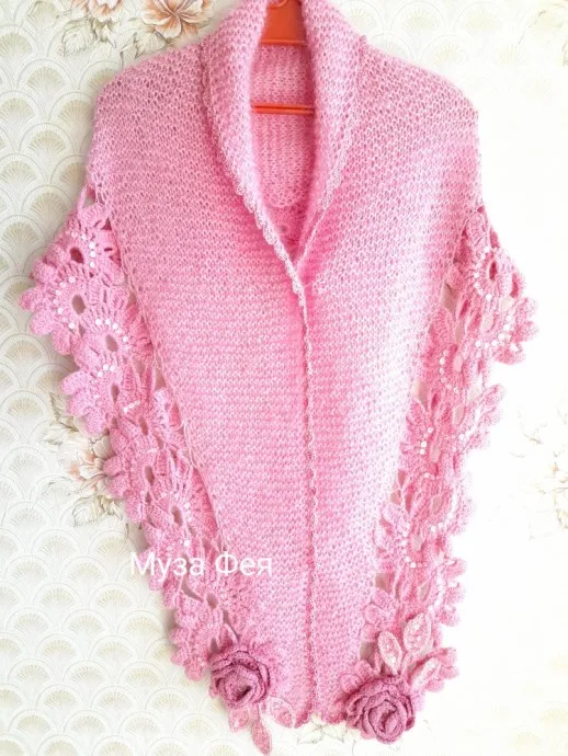 Связала бактус, вес- 220г: Основа - 100г турецкой пряжи Натурале (60% шерсти, 40% хлопка) и кружево -100г 100% шерсти Пехорка "Секрет успеха" (250м/100м).. Отделка - розы, листики, фестоны, пайетки.