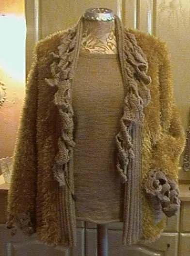 Фотать некому. Все по отпускам. Но не хило смотрюсь. Брюки в тон, на 7/8, но уже узковаты. Я купила травку под чернобурку. Черная, с белыми кончиками. Как придет что-то интересное в голову, свяжу.
