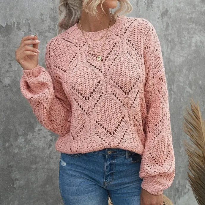 Свободный джемпер нежного пудрового оттенка — отличный вариант как на весну, так и на прохладные летние дни. Связан красивым ажурным узором, в основе которого английская резинка. А если внимательно присмотреться к рисунку петель, то вы заметите, что помимо патентной резинки здесь ещё есть жемчужный узор.