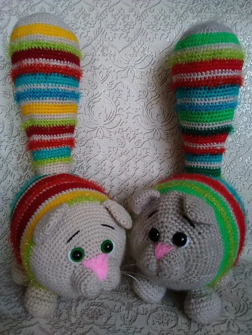 Связала дочери забавного кота. Кот понравился подружке дочери. Связала подружке. А потом и детки попросили. Связала деткам. Теперь вяжу усатых-полосатых по просьбе своих знакомых. К пряже Детская новинка добавляю пряжу cristmas yarnart. Блеск и пушистость придают особую прелесть этим игрушкам.