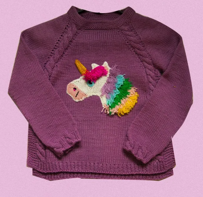 Украшен аппликацией единорожки и косами.