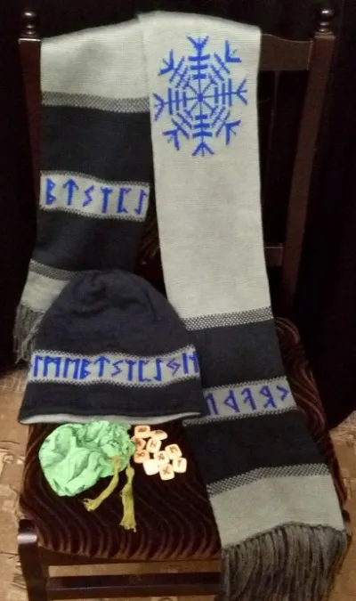 Сын обожает шапки. И вот захотелось ему шапку с рунами. Связала и вышила 3 руны впереди, но дня через - забыл в электричке и тогда родился этот комплект, назвали "Оберег".