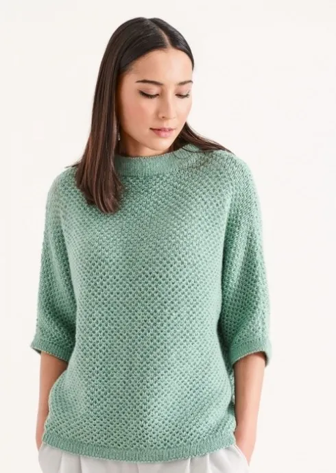 Вам потребуется: 450 (500) 550 г светло-зелёной пряжи Lana Grossa «Lасе Sеtа» (70% альпака, 30% шёлка, 250 м/50 г); спицы № 4,5 и 5,5; круговые спицы № 4,5.