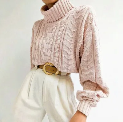Первая модель — симпатичный свитер в приятном оттенке розового, комбинирующий в себе сразу несколько простых, но эффектных теневых и рельефных узоров.