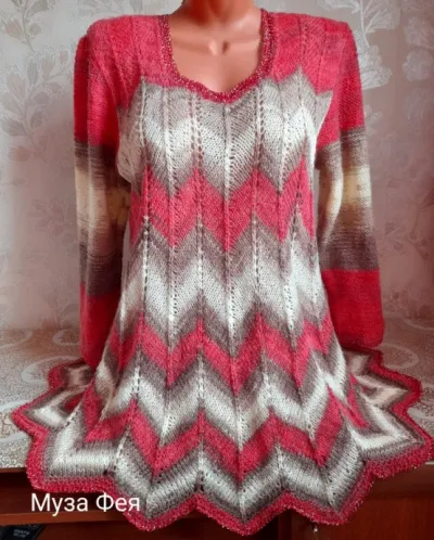 Пуловер "Красная гвоздика" в стиле Миссони к юбке, спицами