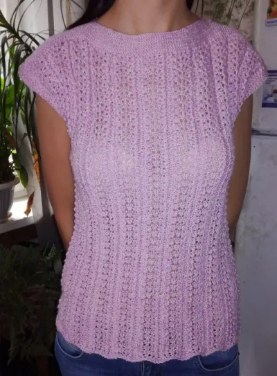 Вязать снизу, нужным вам размером, ориентируясь на объём бедер. По кругу, без швов, сначала резинку 1×1, потом перейти на узор. От начала проймы разделить вязание на спинку и полочку. Горловину полочки и росток спинки формируем недовязанными рядами, и сразу после формирования выполняем отделку горловины чулочной вязкой. Сшить по плечам. Скос плеча не делала, прибавки на свободу облегания тоже. Т.е, от низа и до плеч вяжем просто прямоугольник, если бы смотреть на выкройку