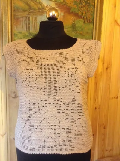Еще одна работа в технике филейного вязания.Это летний топик из чистого хлопка.Пряжа" Успешная"Пехорка.Понадобилось 250г.Размер 50-й.