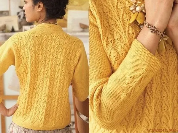 Плотность работы: 24 п. и 32 р. = 10 см, по узору, спицы 3.5 мм.