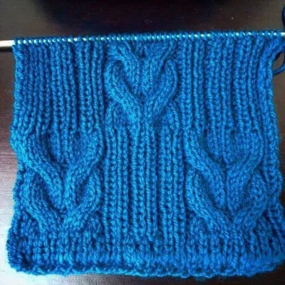 5 ряд: 1 изн., 3 п за работой на вспомогательной спице, 3 лиц., затем провязать 3 п со вспогательной спицы., 1 изн., 3 пет. оставить перед работой на вспогательной спицы, 3 п лицевыми, 3 п со вспомогат. спицы, 2 изн., 1 лиц., 1 изн., 1 лиц., 2 изн., 1 лиц., 1 изн., 1 лиц., 2 изн., 1 лиц., 1 изн., 1 лиц., 2 изн., 3 п за работой на вспомогательной спице, 3 лиц, затем 3 п лиц. со вспомогат. спицы, 1 изн., 3 п перед работой, 3 петли лиц., 3 п лиц. со вспомогат. спицы, 1 изн.