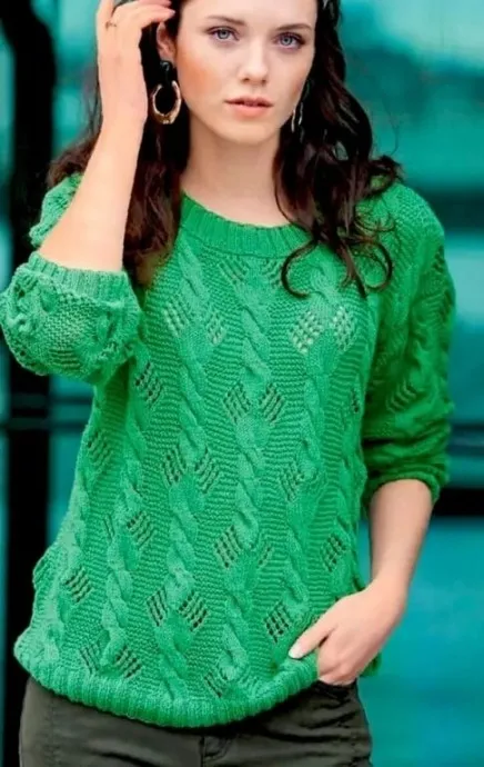 Ажурный узор из «Кос». Число петель кратно 36 + 18 = вязать согл. схеме. На ней даны лицевые ряды. В изнаночных рядах все петли и накиды провязывать изнаночными. Для 1-го размера раппорт постоянно повторять, закончить петлями до стрелки; для 2-го размера начать с последних 9 п. раппорта, раппорт постоянно повторять, закончить первыми 9 п. раппорта, при этом неполные перекрещивания по краю заменить лицевыми петлями. Постоянно повторять 1—48-й ряды.