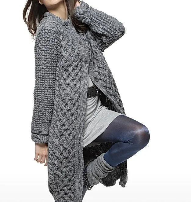 Вам потребуется: Пряжа Rapido (50% полиамид, 25% шерсть, 25% акрил) цвет стальной 32/34/37/40/43 мотка; для более короткого варианта (его фото не представлено) той же пряжи потребуется 30/32/34/37/40; спицы №6; 6,5 и 7; спица для кос; 9 или 8 пуговиц; подплечники