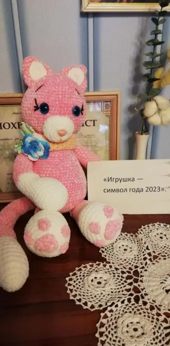 Вот еще одна игрушка - символ 2023 года, правда не Кот, а Кошечка... Использовала остатки пряжи АДЕЛИЯ DOLLY VELOUR. Крючок № 2,75 , винтовые прозрачные глазки 20 мм, наполнитель - холлофайбер