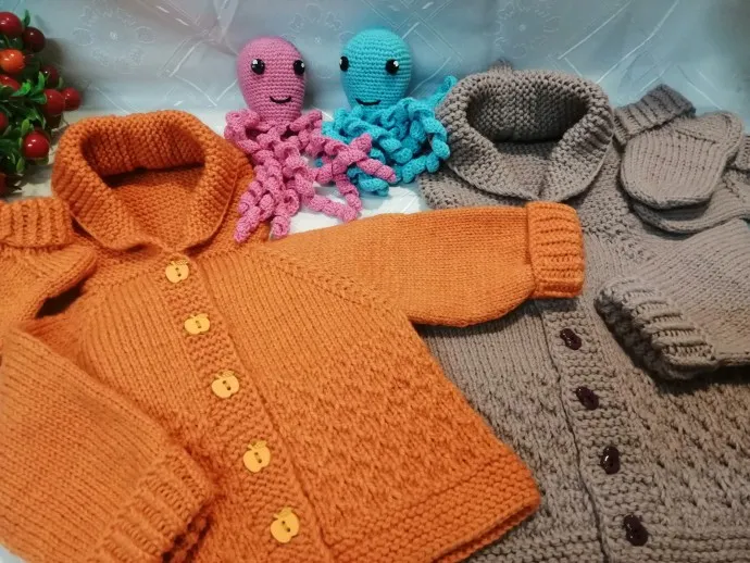 Мои кофточки уйдут на продажу, чтоб покупателю было интереснее, в подарок к каждому изделию я связала носочки и осьминожка.