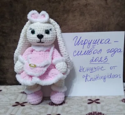 Всем здравствуйте. После просмотра почты я увидала, что проходит конкурс на игрушку символ года 2023. Решила поучаствовать. Игрушек котов и кроликов к новому году связала около 130 шт. Эту зайку - зефирку связала для подруги. Высота игрушки 25-26см, связана из пряжи YarnArt Dolce Baby, крючок 3,5 отделка из пряжи Alize softy, глазки и носик на безопасном креплении. Игрушка цельновязанная, пришиты только ушки. Мастер класс не знаю даже какой, зайка - зефирка сборная, что то переделала , ножки сама делала, так и остальные части игрушки из разных мастер классов. Бантик и сумочку добавила сама.