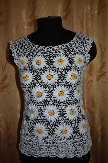 Девочки, хочу поделиться с вами летним настроением) Хочу, чтобы мои ромашки подняли вам настроение, дали заряд положительных эмоций. Из затейливых мотивов получился легкий, ажурный топ. Пряжа "Белое кружево" пр-во "Пехорка" 100% хлопок (475 м на 50 г), крючок №1. На топ 48 размера ушло всего 5 моточков. Хорошего всем настроения и ровных петелек!)