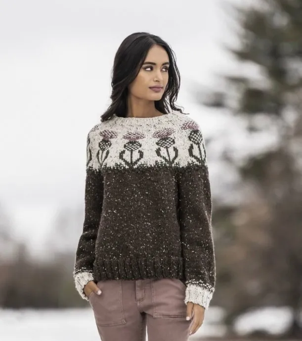 Джемпер с круглой кокеткой с узором «чертополох», вяжем спицами